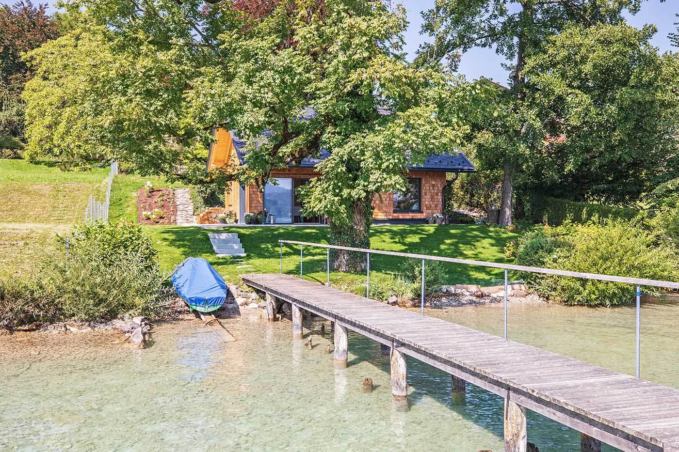 Wir durften am Attersee ein sehr schönes, gemütliches Badehaus in Massivholzbauweise errichten. Die Fassade wurde dabei zur Gänze in Lärche, mit Schindeln und Schalung ausgeführt. So fügt es sich hervorragend in die Landschaft, mit den traditionellen Salzkammergut- Bootshäusern, ein. Besonders zu erwähnen ist die vorzügliche Zusammenarbeit zwischen allen Beteiligten, von der Bauherrschaft bis zu den Professionisten.