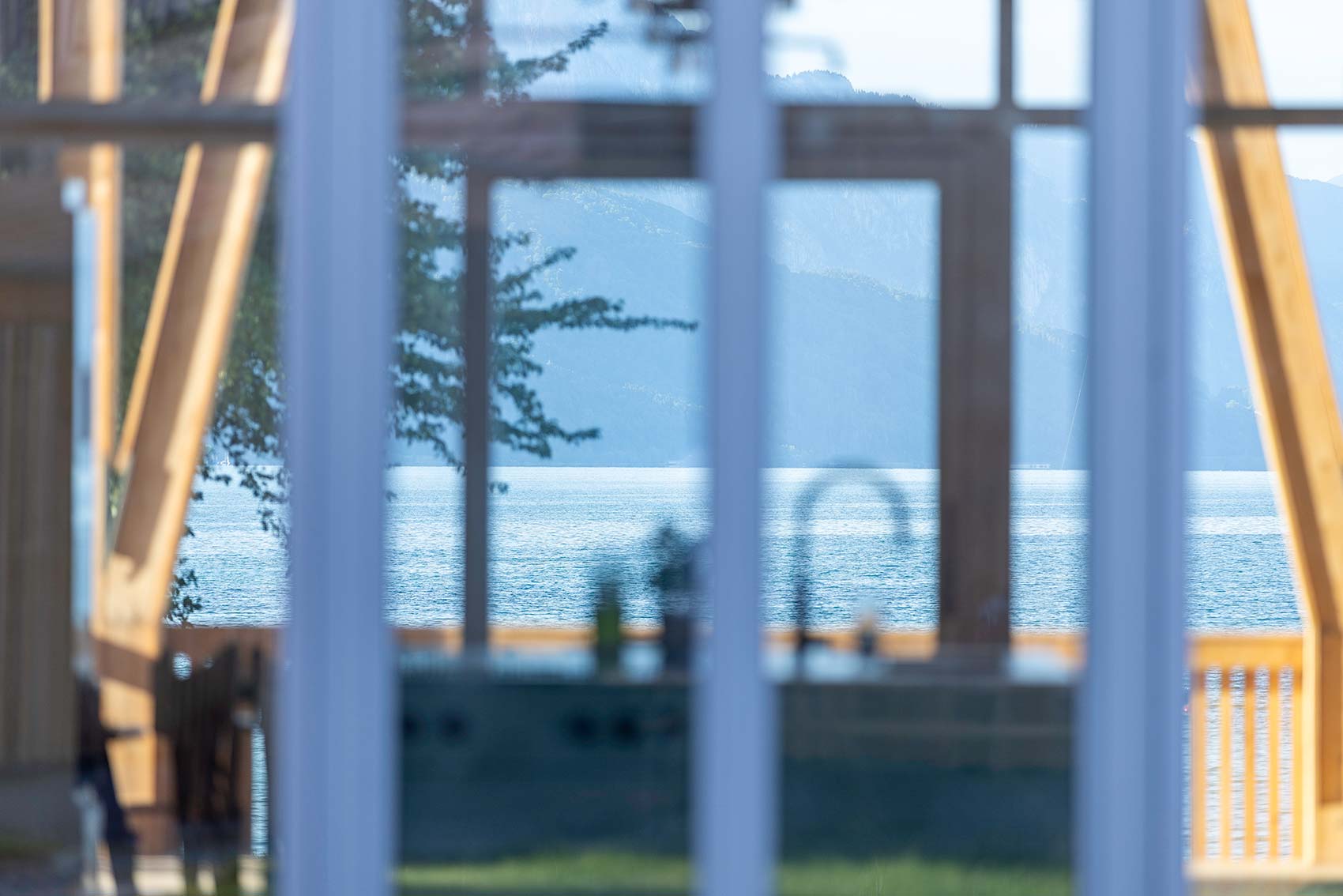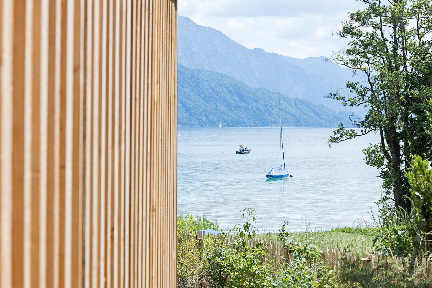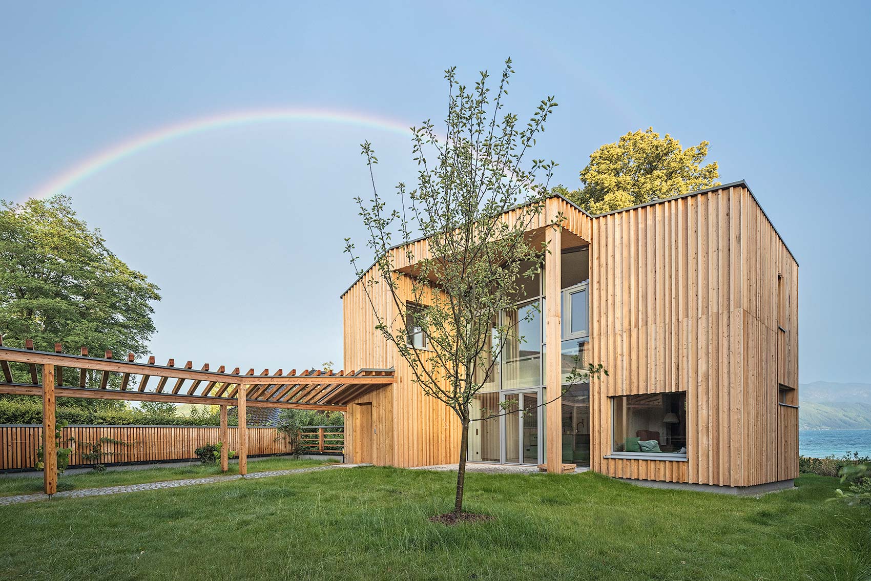 Am Ende eines Regenbogens findet man einen Schatz, so besagt es die alte irische Sage. Und in diesem Fall ist der Schatz aus Holz 😊 Gemeinsam mit Kleboth und Dollnig – Architektur durften wir an einem ganz besonderen Holzhaus, mit vielen spannenden Details, mitwirken. Das Haus wurde unmittelbar am Ufer des Attersees errichtet, welcher im ganzen Gebäude präsent ist. Bereits beim Betreten des Innenhofs blickt man durch das Haus hindurch auf das türkisblaue Wasser.